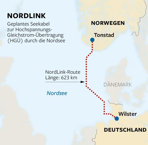 NordLink是首個銜接德國和挪威電網(wǎng)的互聯(lián)體系,被視為可再生動力交流的高度互補,由于德國的風能和太陽能發(fā)電場以及挪威的水力發(fā)電廠能夠作為德國進口動力的“動力庫”。